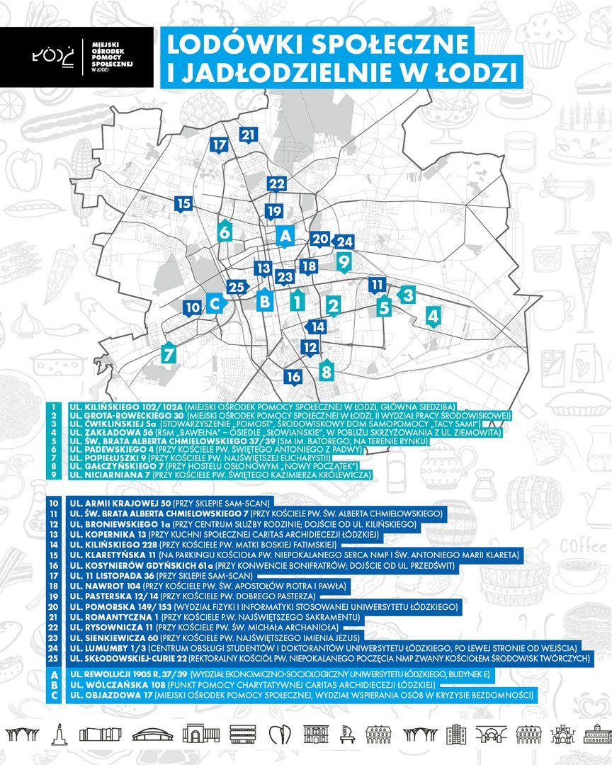 Na terenie Łodzi funkcjonuje obecnie 25 lodówek społecznych – w tym dziewięć miejskich: przy głównej siedzibie MOPS w Łodzi przy ul. Kilińskiego 102/102a, w sąsiedztwie siedziby II Wydziału Pracy Środowiskowej łódzkiego MOPS przy ul. Grota-Roweckiego 30, przy siedzibie Środowiskowego Domu Samopomocy „Tacy Sami” przy ul. Ćwiklińskiej 5a prowadzonego przez Stowarzyszenie „POMOST", w sąsiedztwie bloku przy ul. Zakładowej 56 na Olechowie, w pobliżu skrzyżowania z ul. Ziemowita (osiedle "Słowiańskie" w RSM "Bawełna"), na rynku SM im. Batorego na Widzewie przy ul. Św. Brata Alberta Chmielowskiego 37/39, przy Kościele pw. Świętego Antoniego z Padwy przy ul. Padewskiego 4, przy przy Kościele pw. Najświętszej Eucharystii przy ul. Popiełuszki 9, przy Hostelu Osłonowym „Nowy Początek” przy ul. Gałczyńskiego 7 oraz przy Kościele pw. Świętego Kazimierza Królewicza przy ul. Niciarnianej 7. Wszystkie miejskie lodówki społeczne są czynne przez całą dobę i siedem dni w tygodniu. Na identycznej zasadzie działa pozostałe szesnaście lodówek społecznych rozmieszczonych na terenie całej Łodzi i uruchomionych przez Stowarzyszenie „Chleba Naszego”. Uzupełnienie lodówek społecznych stanowią trzy jadłodzielnie funkcjonujące na terenie miasta, którymi opiekuje się grupa Foodsharing Łódź. W przypadku dwóch jadłodzielni można korzystać z nich w ściśle określonych dniach i godzinach: ul. Rewolucji 1905 r. nr 37/39 oraz ul. Wólczańska 108. Wyjątkiem jest jadłodzielnia przy ul. Objazdowej 17, przy wejściu do siedziby Wydziału Wspierania Osób w Kryzysie Bezdomności łódzkiego MOPS – ona jest czynna przez całą dobę i siedem dni w tygodniu.